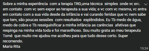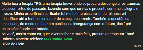 E aqui, nós vamos juntos desenvolver um Plano Futuro de acompanhamento, para começar a aprofundar o seu tratamento. Utilizando técnicas TRG comprovadas no mercado a mais de 10 anos, transformado vidas de verdade em pessoas que já tinham perdido a esperança de viver. E eu vou escutar de você a exclamação que ouço sempre; "porque demorei tanto para buscar ajuda".